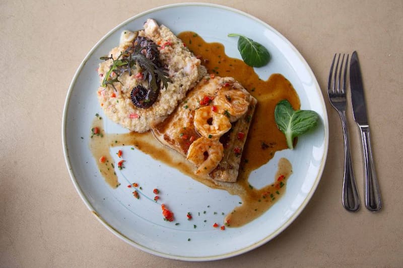 Otra alternativa es el pescado cardenal ($ 15.800), que puede ser salmón, congrio, merluza o albacora por ejemplo, que viene con camarones salteados en salsa de ostras y un quinoto de mariscos.