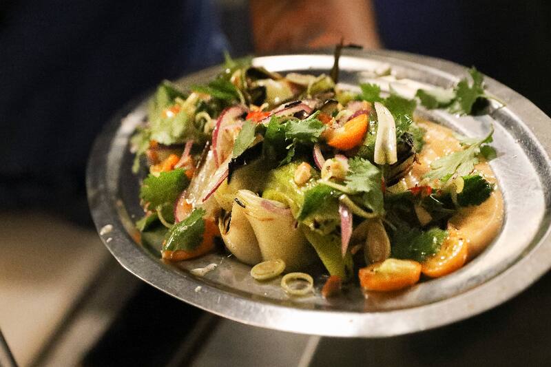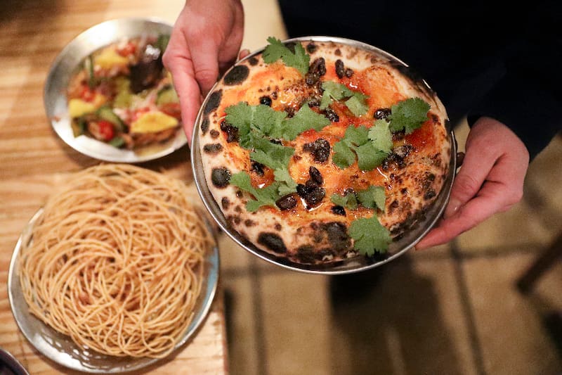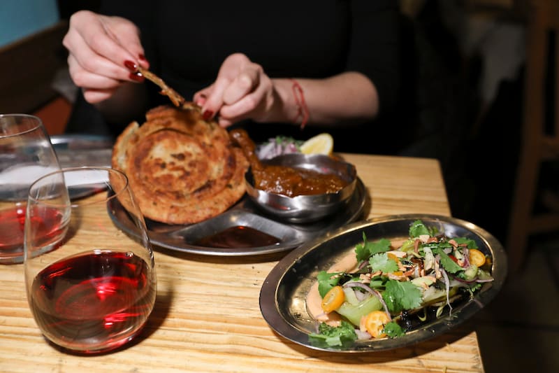 Ahí, todo te llegará en platos de metal, pensados para compartir, como el Roti ($ 2.500), pan plano hecho al hornito de leña, que puedes pedir con mantequilla casera especiada; o con ajíes y porotos rojos fermentados.