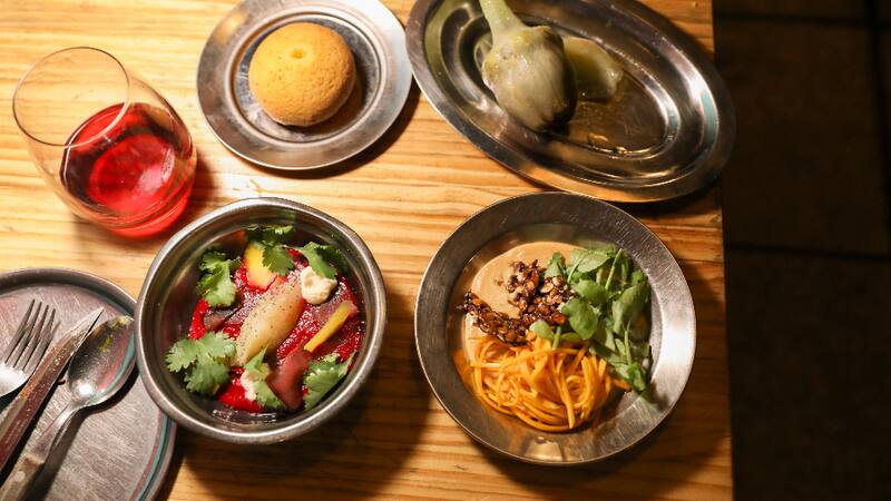 Si se trata de los platos de fondo, prueba el pacu ($ 21.000), pescado de río originario del Amazonas, hecho al hornito de leña, con nueces y chutney de kirkiña, planta aromática; o el Matambrito de cerdo ($ 17.500), con ajíes fermentados y maní.