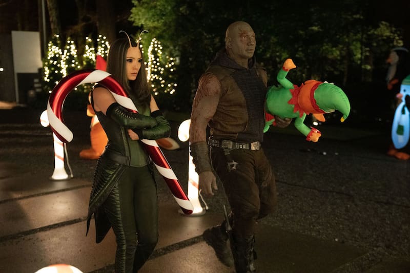 En especial las del fornido y algo irascible Drax (Dave Bautista), y la ingenua y empática Mantis (Pom Klementieff), luego de que deciden hacerle un regalo navideño a un deprimido Peter (Chris Pratt).