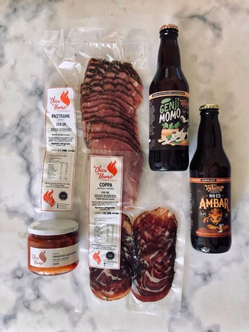 La tentadora caja trae 150 gramos de pastrami; 100 gramos de coppa, el embutido hecho al estilo italiano hecho con el cuello del chancho; salsa de pimientos ahumados y cerveza artesanal de Cerveza Vericcio hecha con hidromiel de @hidromiel_ladivina.