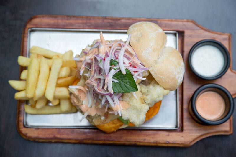 Además, tiene muy buenos sándwiches, como el de “pejerrey” ($ 5.290), con una buena cantidad pejerrey rebozado, lechuga, camote, palta y salsa acevichada, más cebolla morada, cilantro, limón y vinagreta.