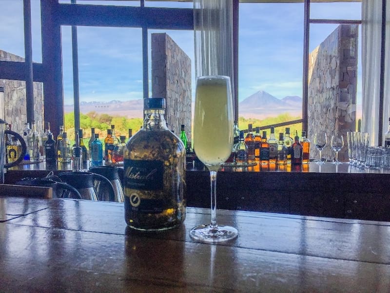 En el bar del hotel Tierra Atacama, a 20 minutos del centro de San Pedro, hacen un pisco sour con sus aromas y sabores, usando un destilado que se macera por horas con la hierba adentro, con tallo y todo para que penetre bien.