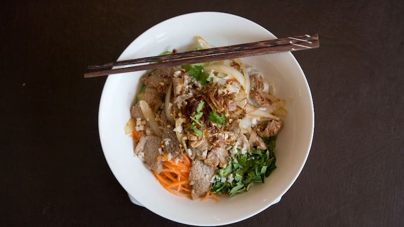 El "bum bo tron ($6.500)" es otro de los platos imperdibles, aunque ojo, es frío. Se trata de un boul con fideos de arroz, delgadas lonjas de carne de vacuno y vegetales como zanahoria y cebollín por ejemplo, más una imperdible salsa de maní que le aporta un delicioso toque "crunchy".