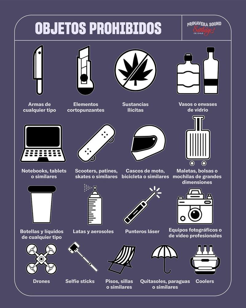 Hay una lista de objetos que no se permitirá ingresar al recinto durante Primavera Sound 2022: elementos cortopunzantes, sustancias ilícitas, envases de vidrio, notebooks o tablets, scooters o patines, cascos de bicicletas o de moto, mochilas grandes, líquidos de cualquier tipo, latas, punteros láser, cámaras profesionales, drones, palos de selfies, paraguas o quitasoles, sillas y coolers son los elementos que no puedes entrar.
