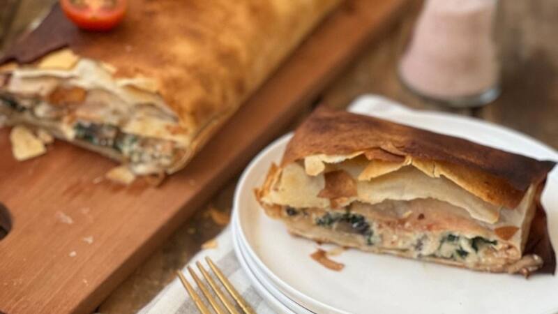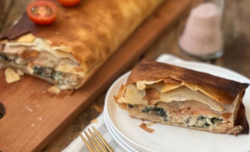 - En una fuente para horno poner papel metálico, poner la masa y un poco de mantequilla derretida, repetir esto con las restantes láminas. Esparcir la salsa de tomate, el queso parmesano y la mezcla del sartén, envolver el relleno con la masa y cerrar las puntas, poner encima un poco más de mantequilla y hornear por 20 minutos, servir caliente como entrada o acompañamiento.