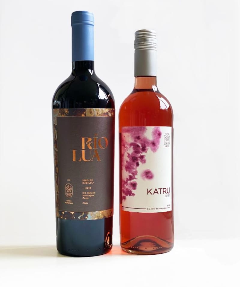 Para regalar ahí encuentras un pack que incluye dos vinos ($17.000), el Río Lua, un tinto fresco, con toques a fruta y ligeramente ácido, que es una mezcla de cepas cabernet sauvignon, cabernet franc, merlot, syrah y garnacha; y el Katru, un rosé con un aroma a frutos rojos maduros, ideal para acompañar mariscos, quesos y encurtidos, por ejemplo.