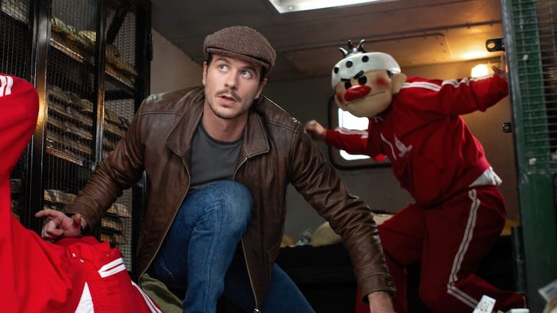 El mismo trío criminal que, con buzos rojos y máscaras de los personajes de los dibujos animados soviéticos Puck! Puck!, escapan en el inicio de la cinta a bordo de un camión de valores que robaron del Banco Rosgarant, mientras vuelan billetes desde su interior.