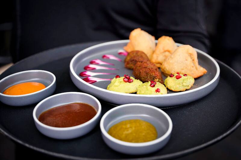 Incluye tres samosas, empanadas rellenas de papa, arvejas, pasas más 12 especies milenarias; dos Hara Bhara Kabab, croquetas de espinaca, menta y cilantro; y cuatro Avocado Chaat, bocados de palta con salsa de tamarindo, dátiles y menta con cilantro.