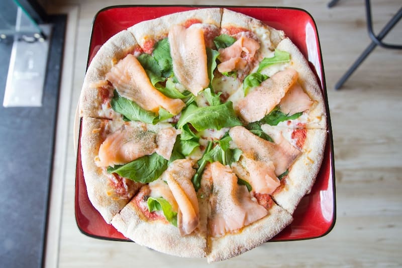 O la "salmone" ($ 7.900) tomate, mozzarella, rúcula, salmón ahumado y eneldo.