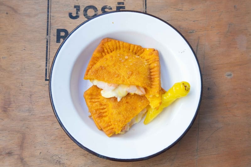¿Otra de las novedades? Sus empanadas fritas, hechas en una masa de sopaipilla crujiente, rellenas de camarón-queso, mechada-queso o pino.
