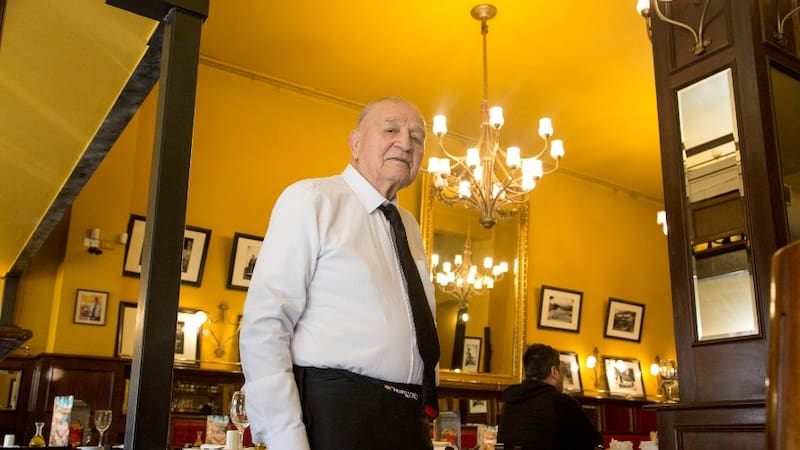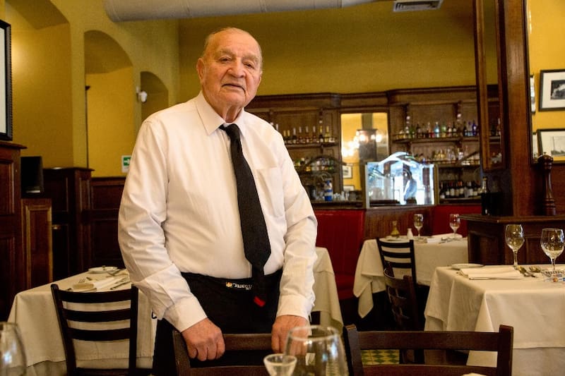 José Santos tiene 90 años y es el garzón más antiguo de Santiago. Este 28 de agosto cumple 60 años atendiendo en el mismo lugar: La Confirería Torres.