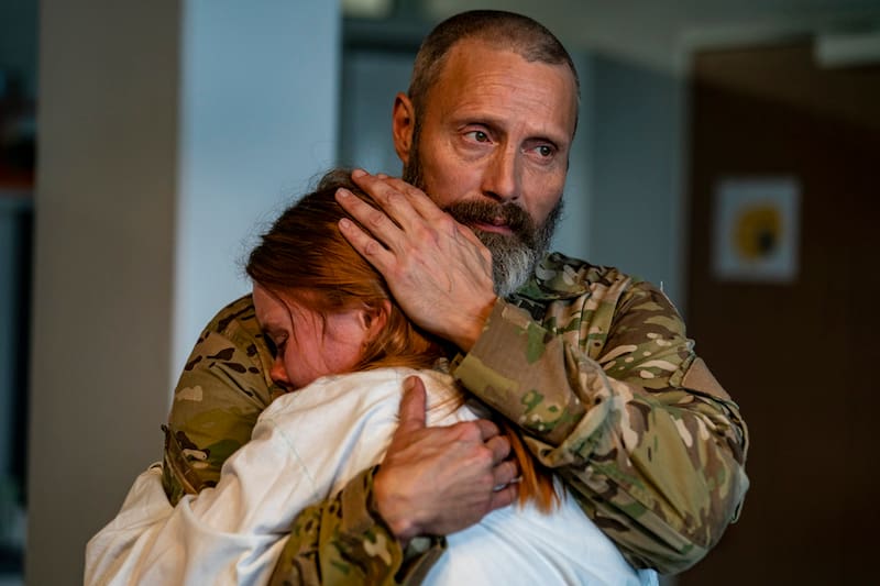 Momento en el que Emma (Anne Birgitte Lind), como se llama la madre, recibe un llamado de su esposo, el escueto Markus (Mikkelsen), quien como soldado está apostado en Medio Oriente y le avisa que le pidieron quedarse allí por tres meses más.
