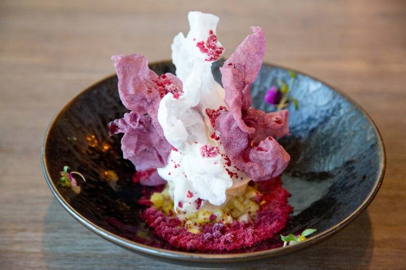 De postre uno bien peruano, el "arroz con leche y chicha morada" ($ 6.900) que es un helado de arroz con leche, crujiente de arroz y chicha morada, más una tierra de chicha.