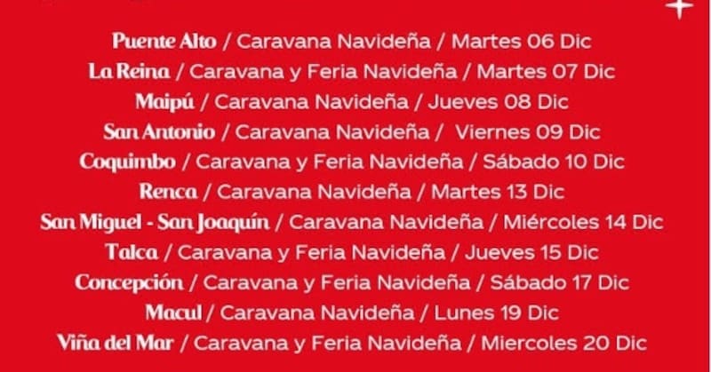 Entre medio la caravana Cola-Cola 2022 tendrá otras fechas en regiones: el jueves 15 en Talca, el sábado 17 en Concepción y el miércoles 20 en Viña del Mar, en su última parada de este año.