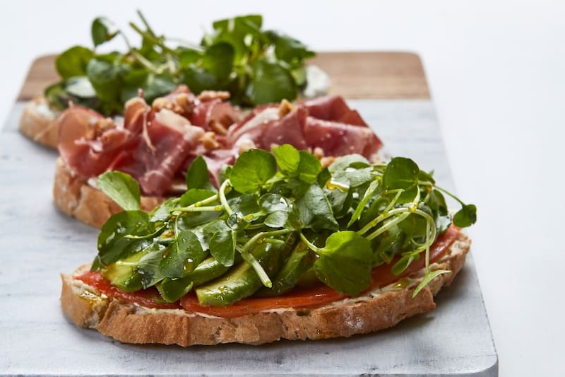 De estas últimas puedes probar las de salmón ($ 5.200), dos tostadas de pan de campo con salmón ahumado, queso crema, palta,brotes de berros y un toque de aceite de cacao.