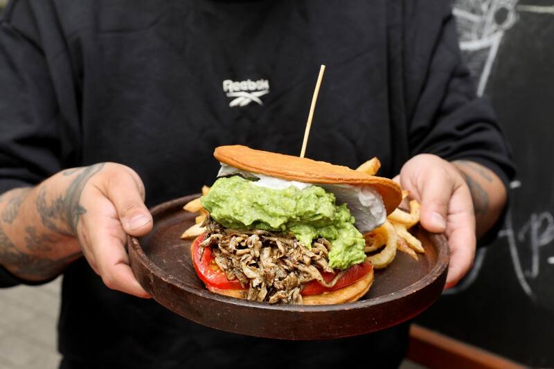 Es pura tentación vegana, porque dentro entre dos crujiente sopaipillas trae un relleno de su mechada de champiñón ostra y, además, palta, tomate y mayonesa.