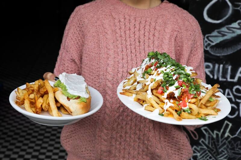 Y si vas en grupo siempre son bienvenidas sus chorrillanas, con papas fritas caseras y versiones como la Amor a la mexicana ($ 11.900), con salsa de queso cheddar, salsa ácida, chile de carne de soja, cilantro, tomate y cebollín.
