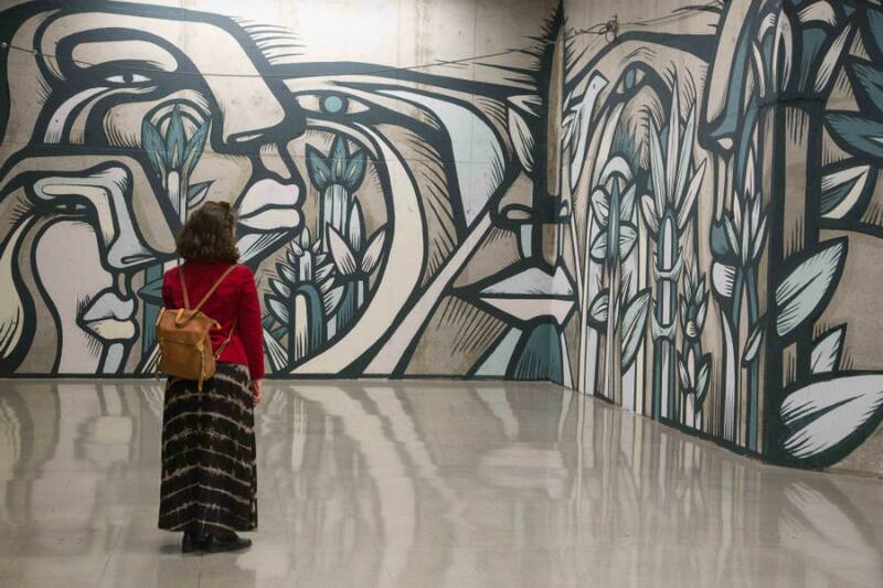 Justo en la combinación de las líneas 2 y 6 del Metro de Santiago, el conocido muralista Alejandro "Mono" González, pintó uno llamado Paisajes Comunes.