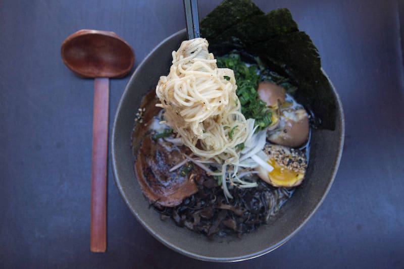 Además de un caldo de huesos de chancho, de más de 10 horas de lenta cocción, lo que logra una consistencia densa y sabrosa; más los fideos temomi, similares a los noodles, pero hechos a mano, e importados de EE.UU.