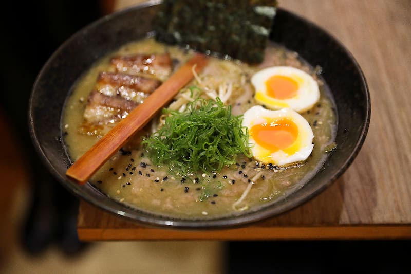 De sus ramen pide el Tonkotsu ($ 12.000), que es un caldo de cerdo, con camarones y sardinas, noodles de trigo, aceite de merkén, solomillo y panceta flambeada de cerdo, pickle de la casa, huevo curado y kikurage, hongos.