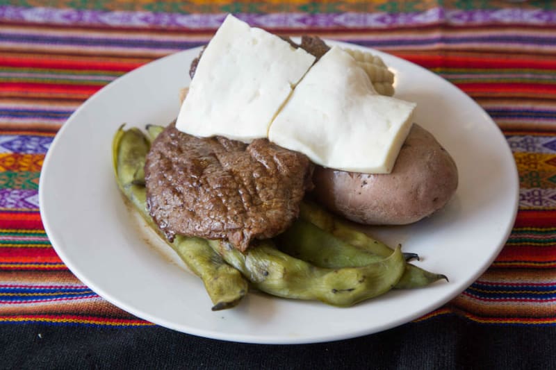 Otro de sus hits es el "plato paceño", con bistec de vacuno, choclo blanco, papa cocida y queso fresco.