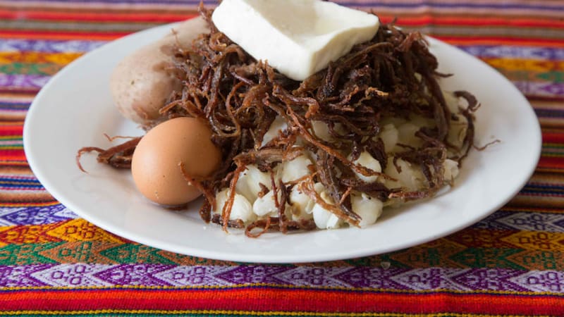 Es una delicia que puedes probar en el "charquekán" (en la foto principal), que además de charqui desmenuzado, frito y crocante, lleva mote de maíz, papa y huevo cocidos, y queso fresco gratinado.