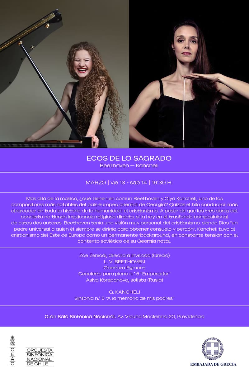 El concierto, apoyado por la Embajada de Grecia, se presentará el viernes 13 y sábado 14 de marzo a las 19:30 horas en la Gran Sala Sinfónica Nacional, en Av. Vicuña Mackenna 20.