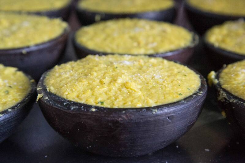 Preparaciones para las que Manuel Hidalgo, su pareja, muele el choclo a la antigua: primero lo corta y luego pasa por un molinillo, que da vuelta a mano, con hojas de albahaca para que se impregne de sabor.