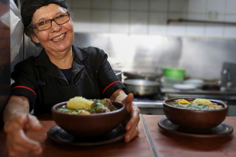 Si eres fan de este plato de cocina chilena, no puedes perderte la cazuela de la "maestra" María: llega humeante en librillo de greda, de ave o vacuno, con el cilantro recién picado, en un caldo imposible de más sabroso y a muy buen precio.