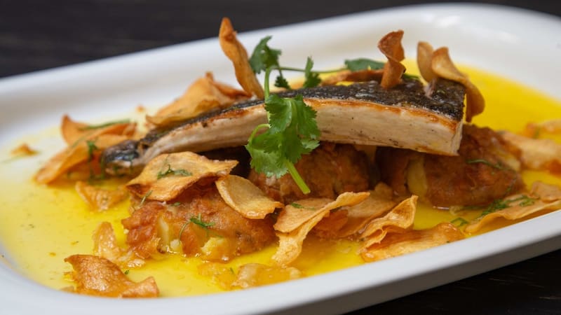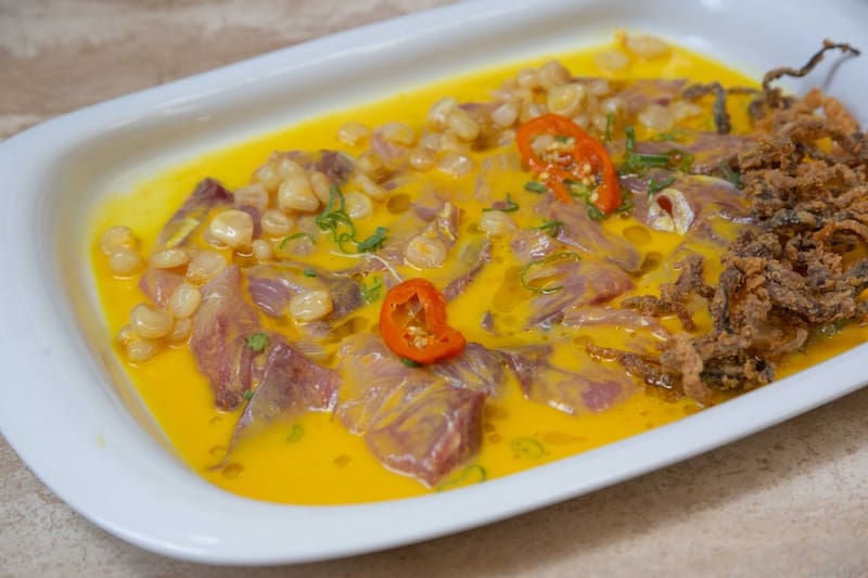 Como un maravilloso cebiche Los Moches, una especie de tiradito con láminas del pescado curado en sal, leche de tigre, aceite de oliva, una inolvidable crema de ají amarillo y chicharrones hechos con la piel del pescado.