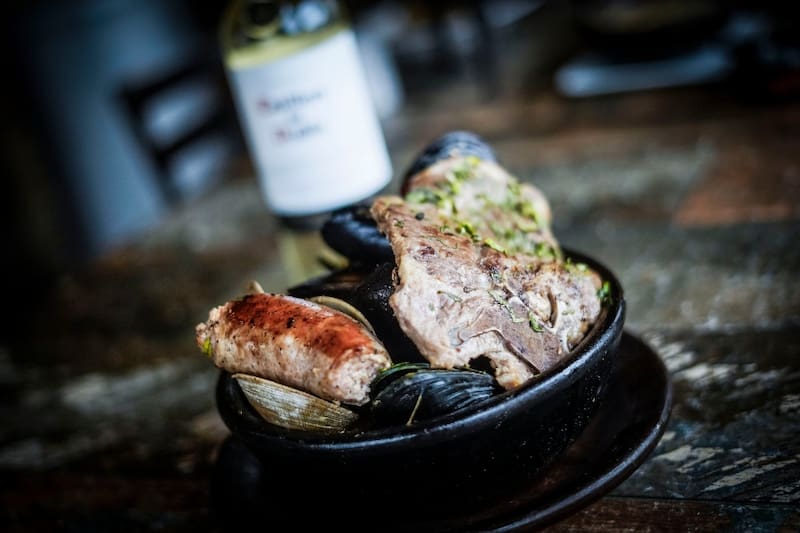 Una paila marina con mariscos surtidos, merluza, chuleta parrillera y butifarra de la casa, que llega con todo su caldo.