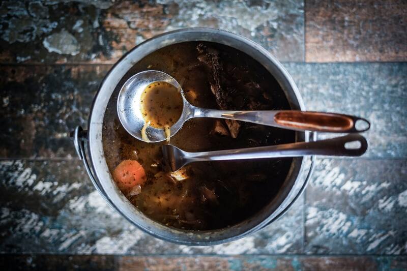 De hecho, a la mesa llega en una enorme cacerola de fierro y adentro un pollo entero trozado y con dos litros de caldo, cocinado por más de horas con verduras, vino blanco y, por supuesto, coñac.