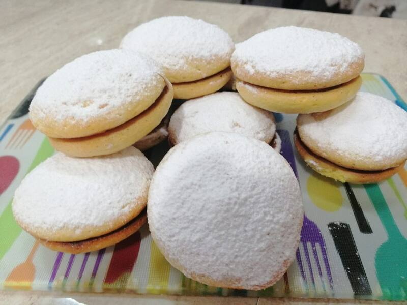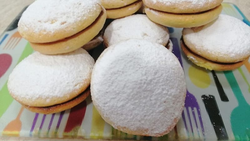 - Dejar enfriar sobre rejilla y rellenar con manjar, luego cerrar con otra tapita y espolvorear mucha azúcar flor.