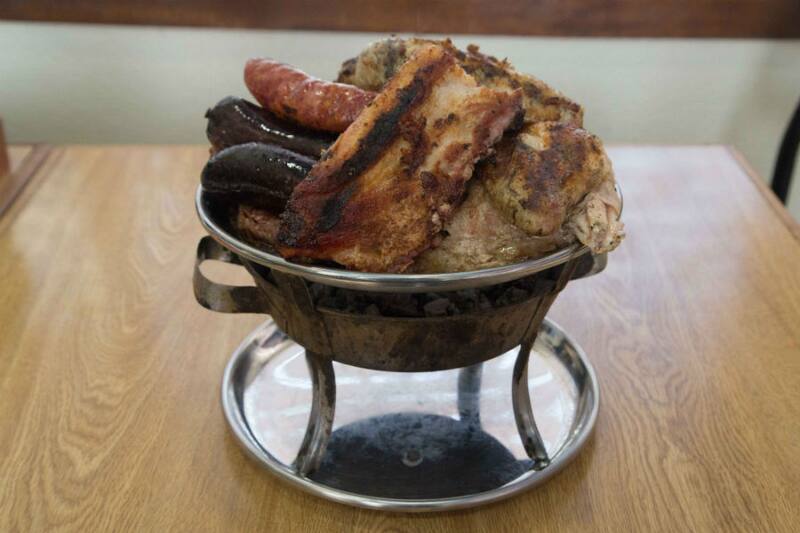 Cuesta $ 29.900 y llegará a tu mesa con el jugo de la carne burbujeante y con dos jugosos lomos que traen de allá, asado de tira, costillar de cerdo, un cuarto de pollo y dos morcillas propias del local. Son similares a las prietas, pero acá las elaboran con nueces y con los condimentos justos para que quede ultra sabrosa. Al partirla te sorprenderás... es un paté delicioso.