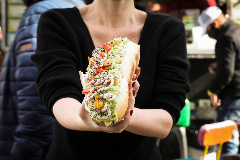 Y en versión vegana. De hecho, aquí encuentras 12 opciones veganas, como el Italiano chilote ($ 3.300), con churrasco vegano (seitán), papa chilota, cebolla caramelizada, tártara que se hace con ajo chilote, mayonesa y queso vegano, más tomate, palta y dos aderezos extras que elijas.