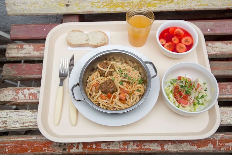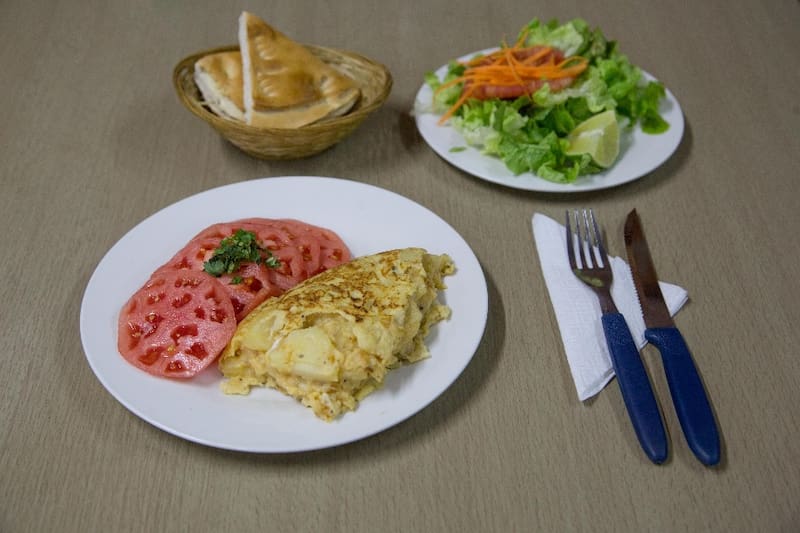 Dependiendo del día, como plato principal puede haber bistec con arroz, cazuela, porotos con riendas o mazamorra o merluza frita sin espina.