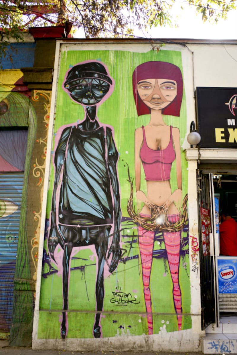 Por Dardignac hacia el poniente hay muchos ejemplos, sobretodo entre Pío Nono y Ernesto Pinto Lagarrigue. Entre los más de cuatro que ahí se encuentran, podrá ver un ejemplo del minimalismo y el trazo delgado de Basco Vazko, en una mujer que parece enredada en un vestido negro. Unos pasos más allá, justo al lado de un minimarket, se ubica un alto mural de Piguan, otros de los frecuentes de Bellavista. Ahí plasma una pareja de larguiruchos jóvenes, de rostros algo surrealistas, parados sobre un fondo de un verde casi fosforescente.