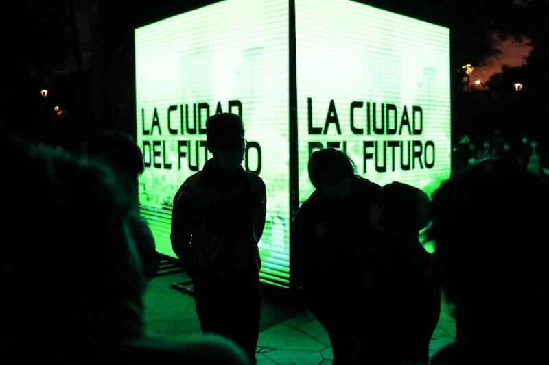 Es parte del festival Santiago a Mil e invita a las personas a responder las interrogantes que se proyectan en un gran cubo luminoso en pleno espacio público.
