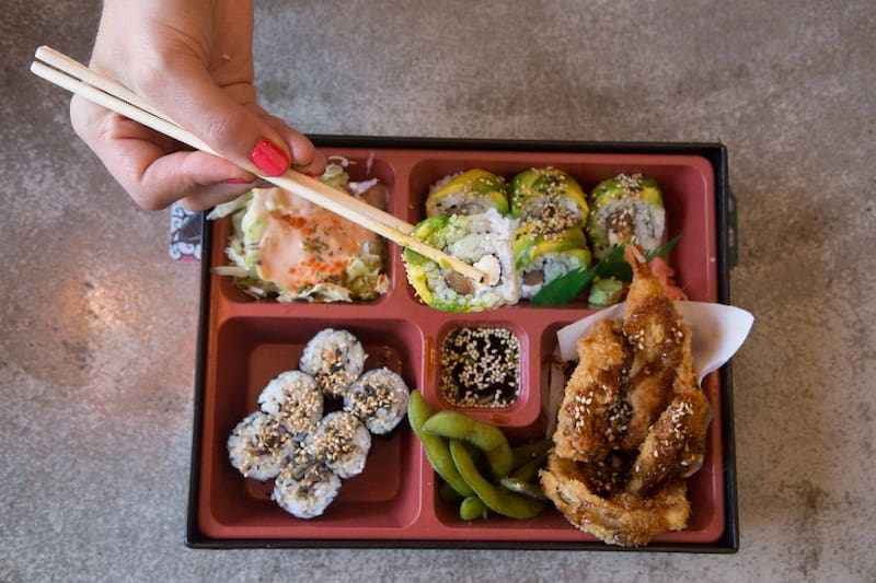 También trae hosomaki, mini sushi envuelto en nori, con salmón en el interior, y edamame, las adictivas vainas de soya con salsa para untar. Todo más ensalada y bebida.