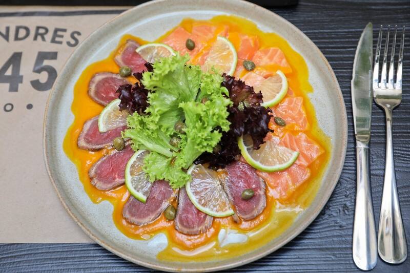 Para partir probando su carta puede hacerlo con una opción de entrada igualmente fresca, como el dúo de tiraditos ($ 12.990), con finos corte de res y salmón marinados en limón, con queso parmesano, alcaparras y acompañado de tostadas.