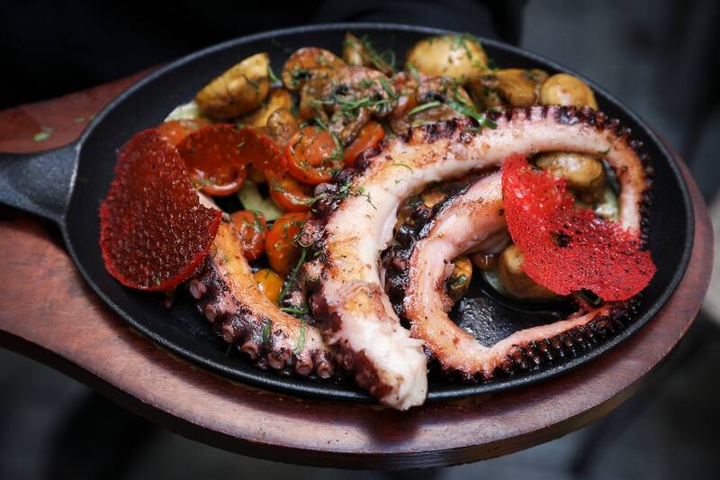 O irte directo a algunos de los fondos, como el pulpo a la parrilla ($ 15.990), con tiernos tentáculo marinados con salsa a base de especias, limón y toques de humo, y que llegan a la mesa con verduras salteadas con un toque de miel.