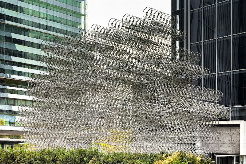 Ojo con lo que estará instalado en la explanada, a la entrada del lugar: ahí verá Bicicletas forever (Forever bicycles, 2015), un montaje de más de mil de éstas unidas entre sí.