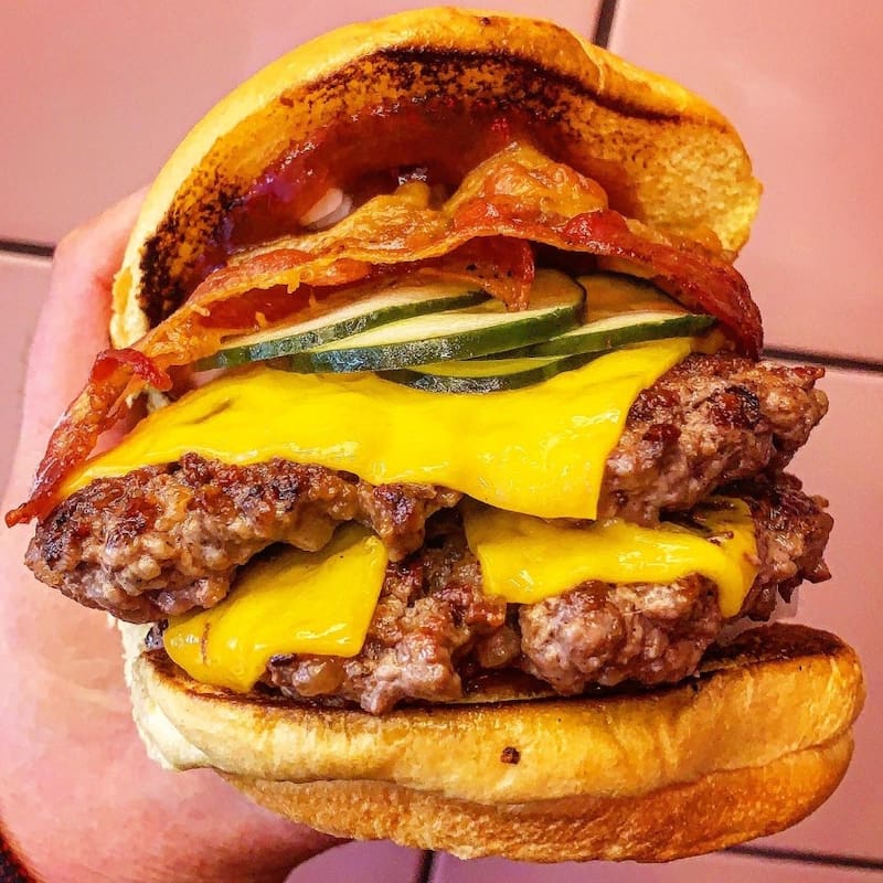 O la dimebag ($ 6.900), que son dos hamburguesas con tocino, cebolla nueva en cubitos, pepino encurtido y sriracha ketchup.