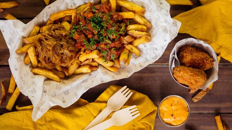 ¿Qué encuentras ahí? Papas fritas recién hechas y 100% naturales, al estilo belga, es decir, con doble fritura, cosa de que queden crocantes por fuera y cremosas por dentro.