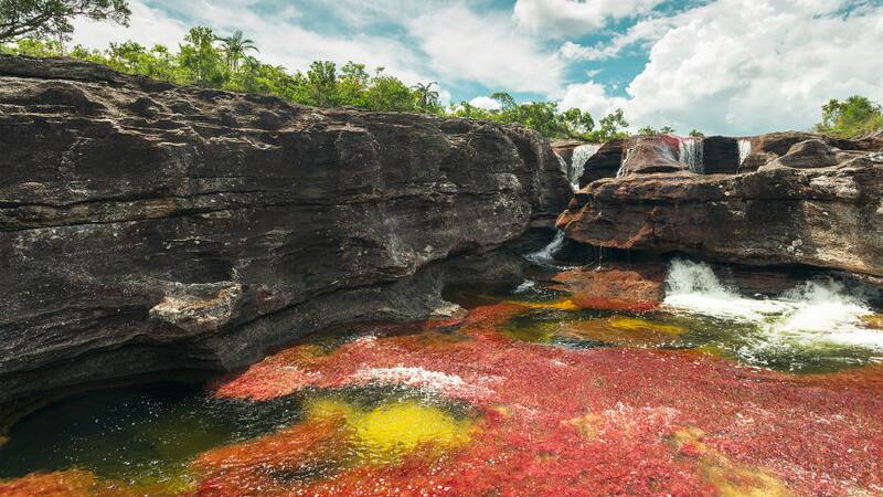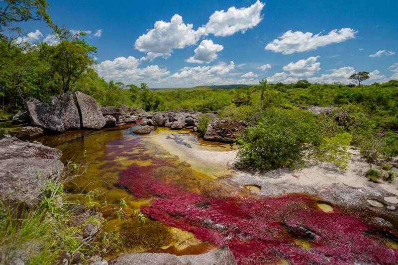 Ubicado en la sierra de Macarena, en el corazón de Colombia, es conocido como "el río de los siete colores" o "el arco iris que se derritió", por las plantas acuáticas —principalmente la Macarenia clavigera— que entre julio y noviembre florecen y tiñen el río Caño Cristales en tonos rojos, verdes, amarillos y azules.