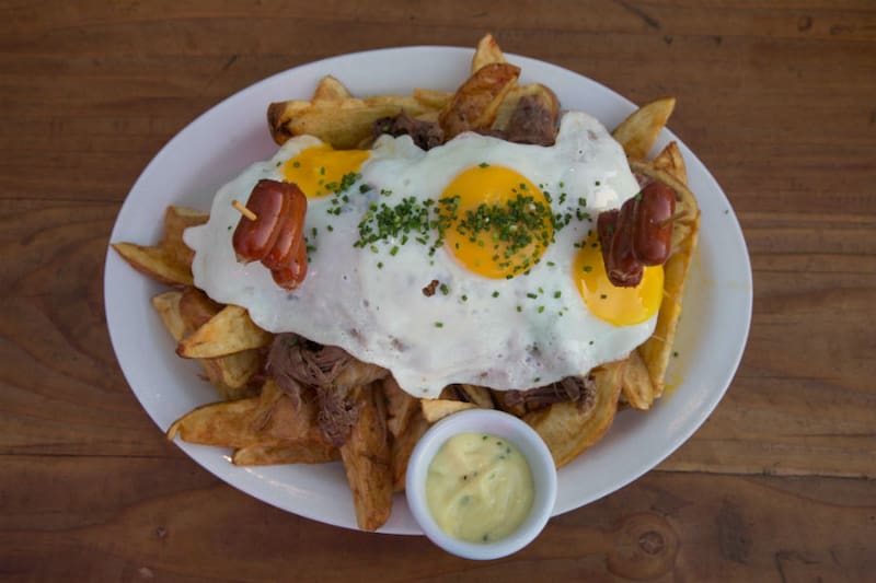 De hecho, ahí preparan unas con papas rústicas, carne mechada deshilachada a mano, cebolla caramelizada que dejan macerar en vino tinto y pera, huevo pochado y salchichas con salsa de la casa para untar ($ 14.000). Son increíbles.
