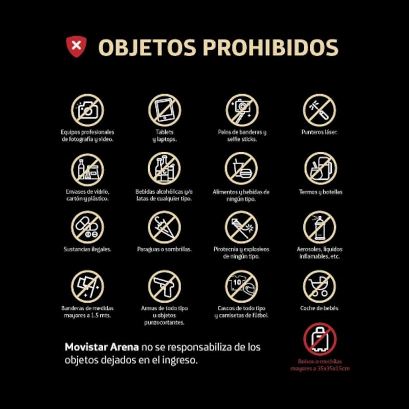¿Y cuáles son los objetos prohibidos de las presentaciones? Varios, entre ellos paraguas y sombrillas y una lista de artículos detallada en la imagen siguiente.