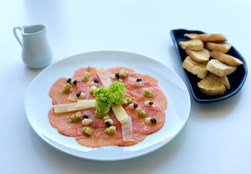 Cocteles que se toman junto a la carta a cargo de Luis Cruzat, a quien probablemente conozcas porque estuvo a cargo del Restaurant Latin Grill Hotel Marriot y que aquí tiene un estilo de cocina mediterránea, con alternativas frescas como el carpaccio de salmón ($ 9.900), que viene con un aderezo de alcachofas, alcaparras y queso parmesano.