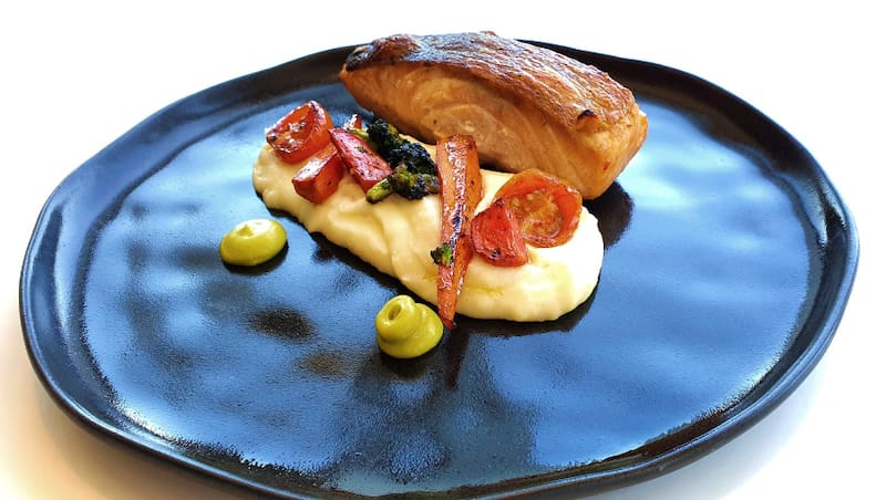 Entre los platos de fondo de lunar encuentras el salmón ($ 16.900), con puré de papa con toques de alcachofa y vegetales encurtidos y salteados en aceite de sésamo; o la AC Burger ($ 14.900), una hamburguesa casera, con queso cheddar, tocino, lechuga, tomate, cebolla y pepinillos, acompañada de papas fritas.